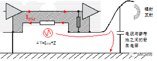 那是不是等于产品的辐射就控制住了?远远不是,我们需要再进一步扩大自己的视野。看一下图3,图中PCB上的高频信号在“0V”地上回流时,由于地上的阻抗也会产生压降ΔV,这个电压再驱动图中右侧与之相连的电缆,就产生的流向外部的共模电流,当此共模电流流过电缆时,由于电缆的长度较长,具备等效发射天线的条件,就产生了辐射,这种辐射叫共模辐射,它是产品辐射超标的典型原理。相比于只看到信号环路辐射的人,看到共模辐射的人的视野更大。