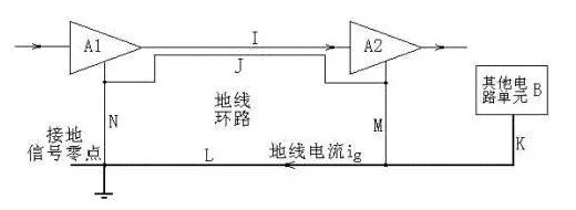 ②去除M:环路消失,但是我们发现,此时放大器A2的地线电流需要流过J、N到达接地零点,注意N段是A1和A2共同的接地线,因此A2接地电流在N上形成的电压降就加到了A1上,形成干扰。这种因共用一段地线而形成的干扰称为“公共阻抗干扰”。